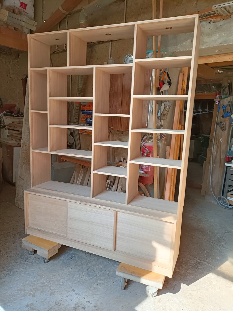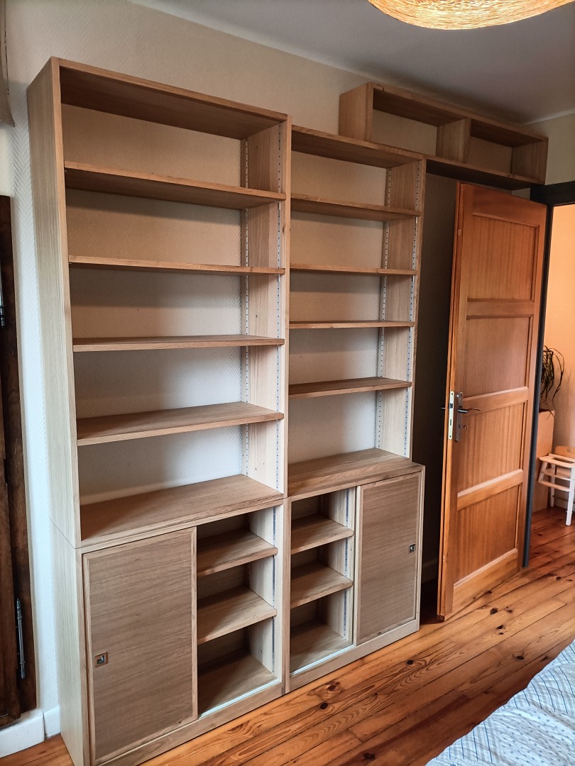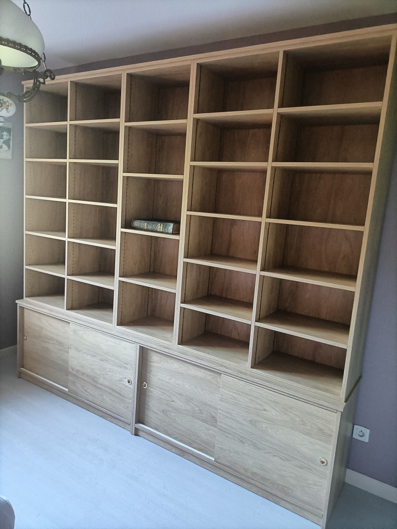 bibliotheque cotemporainechene massif, 3 portes coulissantes, pour differentes ouvertures.