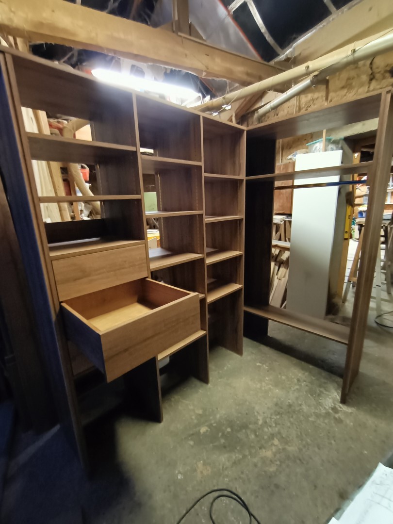 Petit dressing sous escalierFrêne massif, avec une facade mural de 2 portes d'armoire.