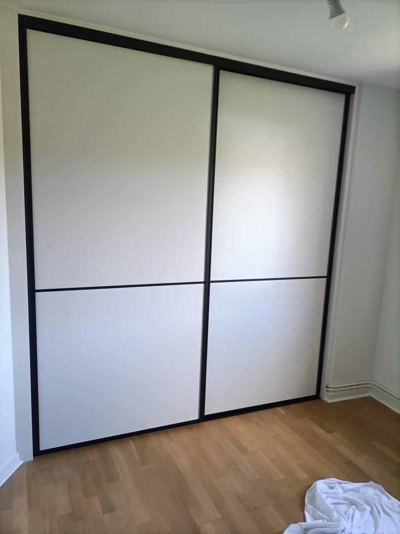 Placard muralMélaminé blanc et son cadre en alu, 2 portes coulissantes et son aménagement intèrieur