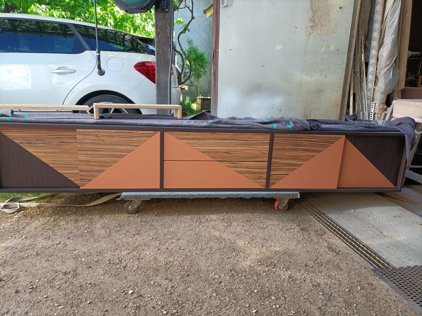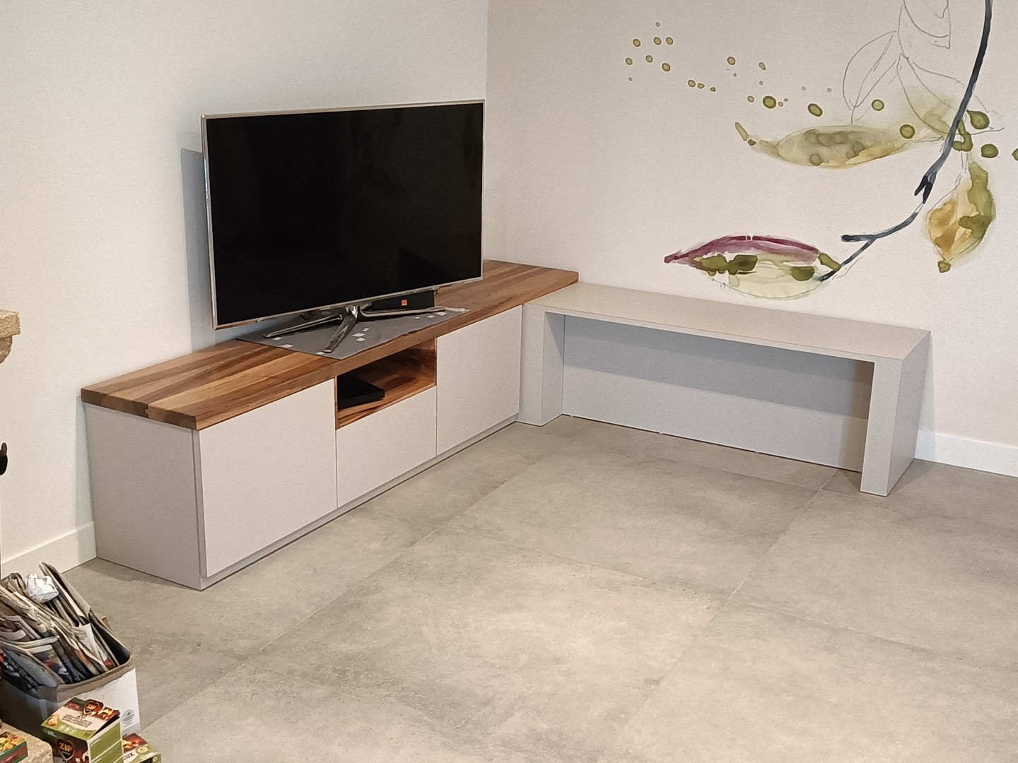 TV contemporainChêne massif, avec un grand tiroir et une niche,la finition et une teinte grise, verni mat.