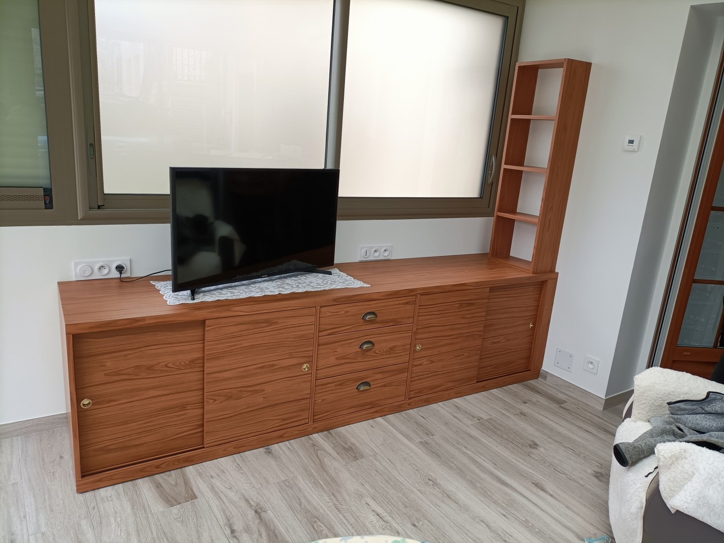 Meuble TV et décoFrêne massif, 2 portes coulissantes, 3 niches et 2 abattants, dont un a l'intèrieur cache une imprimante, monté sur coulisses.